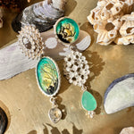 Pieza Única. Aros de ensamblaje donde se reúnen piezas de plata, calcedonia, cristal de cuarzo y 2 paisajes de resina pintada a mano, ramitas naturales y hoja de oro 22k enmarcados en plata.