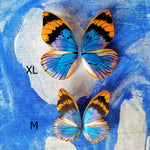 Nos demoramos un poco en dar con los colores, y la verdad es que la foto no logra captar el efecto tornasolado hermoso que pasa de azul eléctrico a violeta. Cada aro es la mitad de una Mariposa que juntas forman una completa enmarcando tu cara.