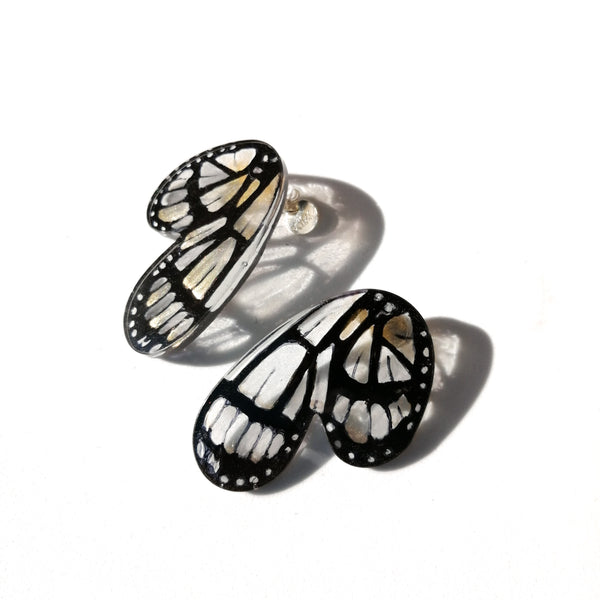 Realizadas en resina con pin y tuerca de plata, cada par es dibujado y pintado a mano con mucha paciencia, destreza, finos pinceles y buen pulso. Cada aro es la mitad de una mariposa, que puestos enmarcan la cara formando la mariposa completa.